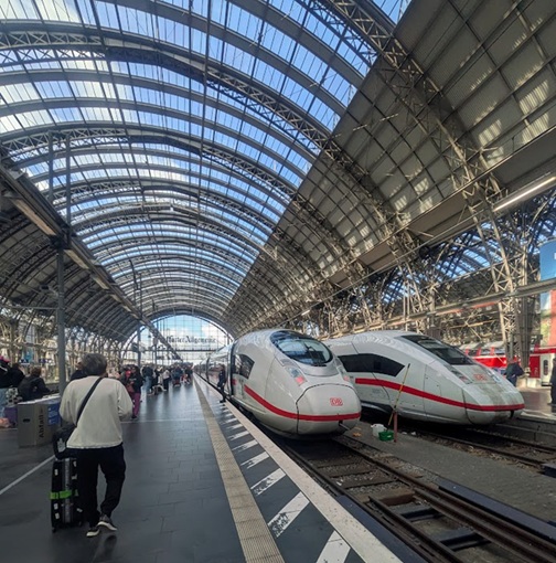 フランクフルト中央駅構内のドーム型天井とドイツの高速鉄道「ICE」