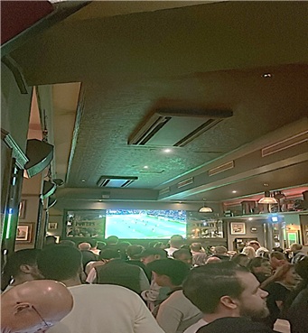 試合はフランクフルト中央駅前のパブで観戦しました。店内はホームチームのサポーターでぎゅうぎゅう詰めの状態で、大歓声とともに大いに盛り上がっていました。試合はホームのフランクフルトが勝利し、サポーターたちは大合唱しながら帰路につく姿が印象的でした。