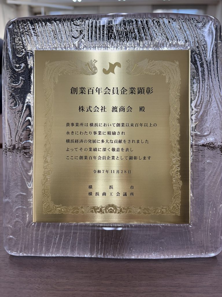 News お知らせ ホームお知らせ横浜商工会議所 創業百年会員企業顕彰 表彰式 - 株式会社渡商会 2026.01.08 お知らせ 横浜商工会議所 創業百年会員企業顕彰 表彰式 このたび、令和7年11月28日に横浜市庁舎で開催された「横浜商工会議所 創業百年会員企業顕彰 表彰式」にて、当社が表彰されました。長きにわたり事業を続けてこられたのは、支えてくださった皆さまのおかげです。心より感謝申し上げます。今後とも引続きご支援ご愛顧のほど、よろしくお願い申し上げます。
