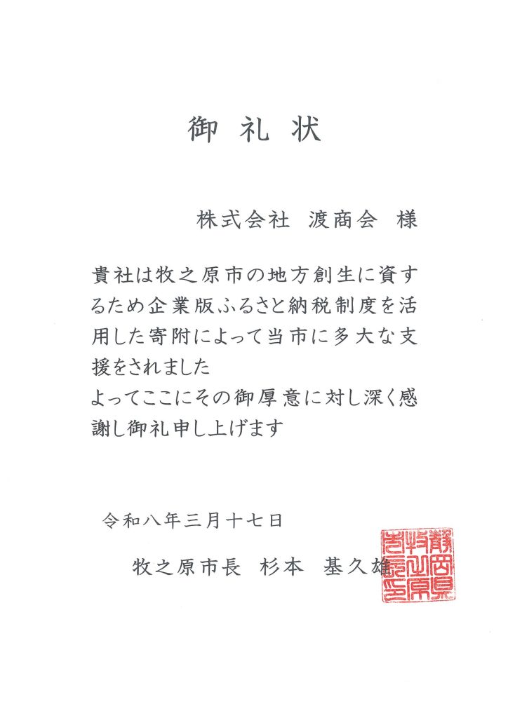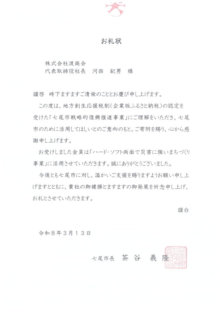 News お知らせ ホームお知らせ企業版ふるさと納税による寄付に対し、市長よりお礼状をいただきました - 株式会社渡商会 2026.03.27 お知らせ 企業版ふるさと納税による寄付に対し、市長よりお礼状をいただきました 当社は、地方創生応援税制(企業版ふるさと納税)を通じて地方創生事業を支援しております。 この寄付に対し、石川県七尾市長、静岡県牧之原市長より御礼状を賜りましたので、ここにご報告申し上げます。